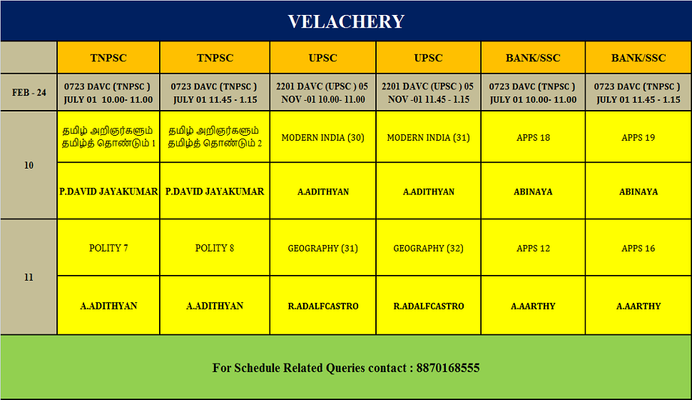 Feb92024Schedule ANNA NAGAR DINDIGUL ERODE GANDHIPURAM KALAVASAL KARUR SALEM THALLAKULAM THAMBARAM THENI THIRUPUR TRICHY VADAPALANI VELACHERY VASANTHA NAGAR VIRUTHUNAGAR Category: ScheduleBy suvethaFebruary 9, 2024 Share this post Share on FacebookShare on Facebook Share on XShare on X Pin itShare on Pinterest Share on LinkedInShare on LinkedIn Author: suvetha Post navigationPreviousPrevious post:PNB SO Recruitment 2024 Out – Apply Online for 1025 Specialist Officer Posts!!NextNext post:WEEKEND TEST SCHEDULE FEB 10th & FEB 11thRelated postsWEEKDAYS CLASS SCHEDULE MAY 6th to 10thMay 5, 2024WEEKEND CLASS SCHEDULE MAY 4th & 5thMay 3, 2024WEEKDAYS TEST SCHEDULE APRIL 29th to MAY 3rdApril 28, 2024WEEKDAYS SCHEDULE APR 29th to MAY 3rdApril 28, 2024WEEKEND TEST SCHEDULE APRIL 27th & 28thApril 27, 2024WEEKEND CLASS SCHEDULE APRIL 27th & 28thApril 27, 2024